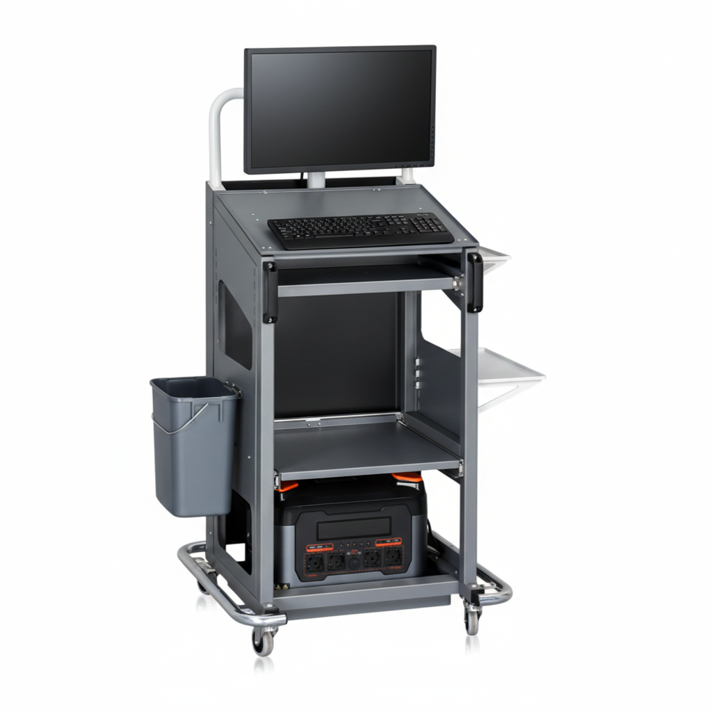 Mobile IT trolley with 230V power pack and 2400Wh LMFP battery for ~8 hours runtime. Fast charge ~1.5 hours. Ideal for warehouse/logistics with printer, scanner and laptop. Delivery NL/BE/EU.