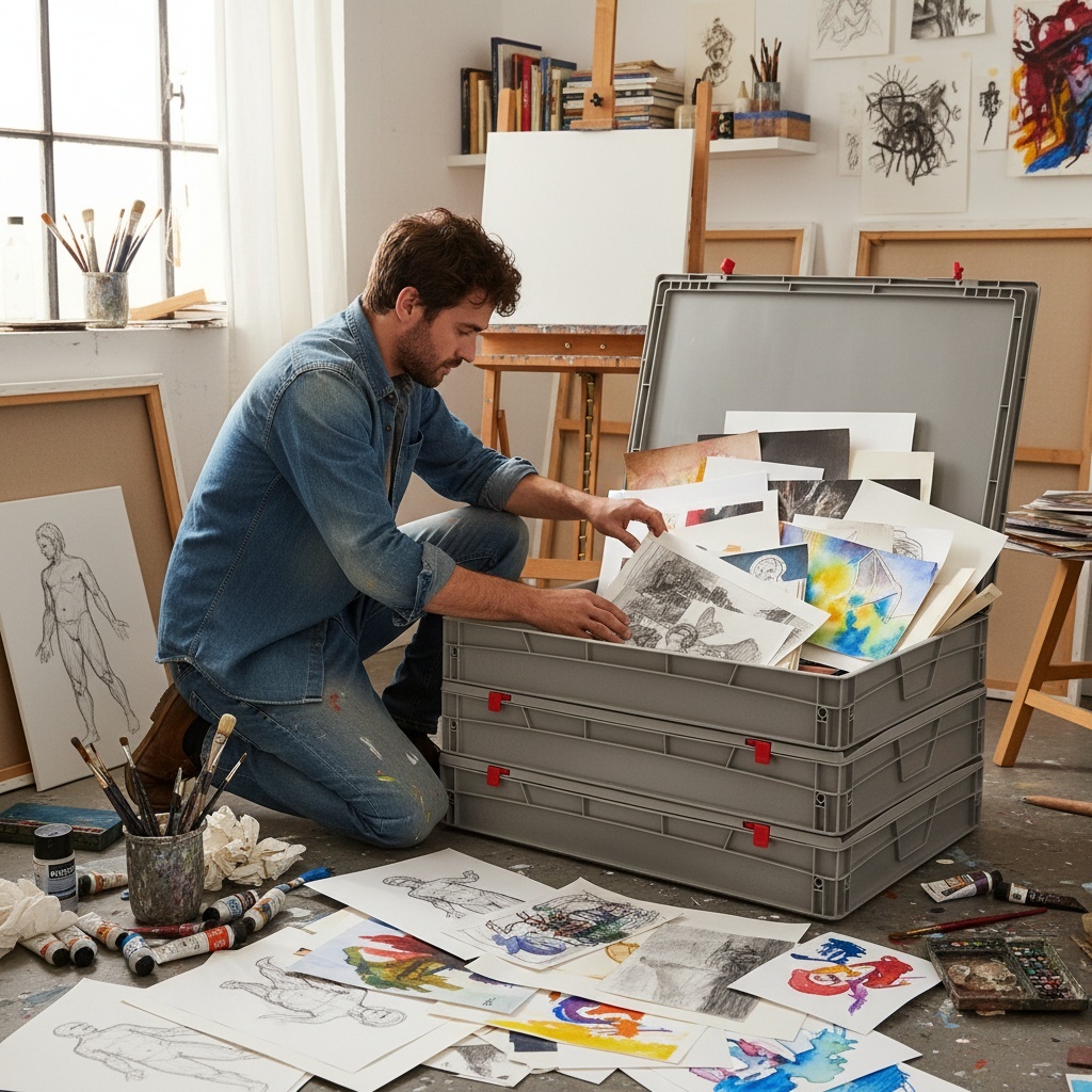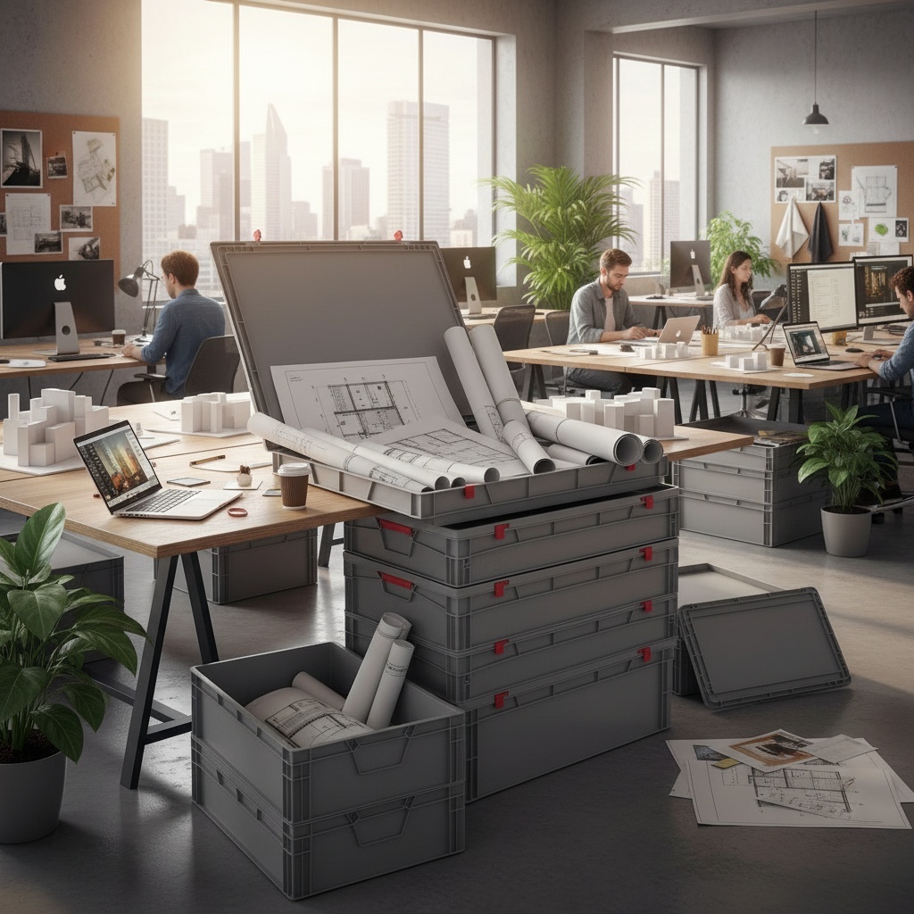 The Euro crate 80x60x13.5 cm with lid is a universal workhorse for every industry. Its low profile makes it perfect for storing and transporting large documents, drawings, and flat materials, making it ideal not only for industrial use but also for schools, art studios, and engineering offices.