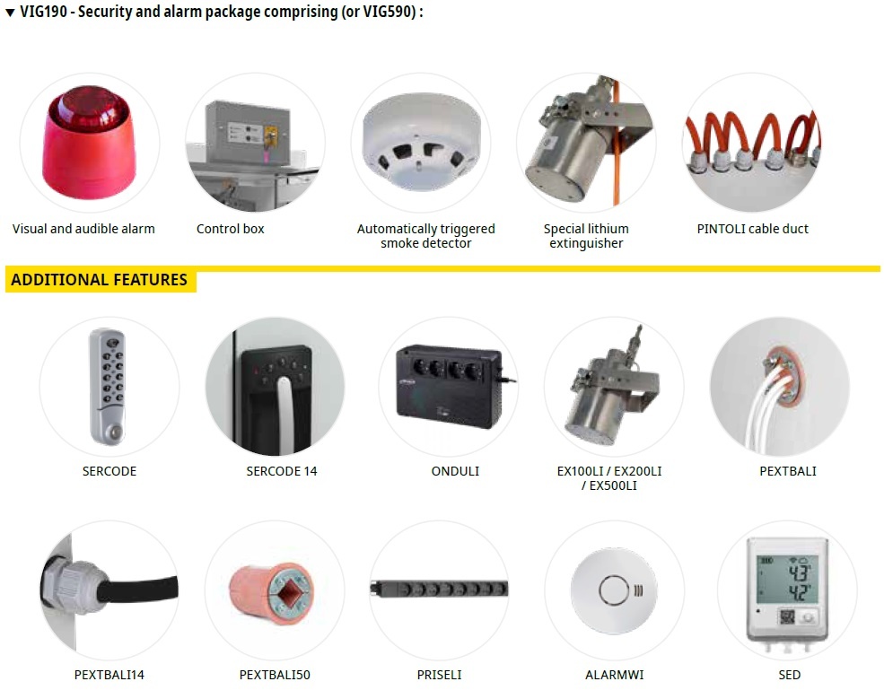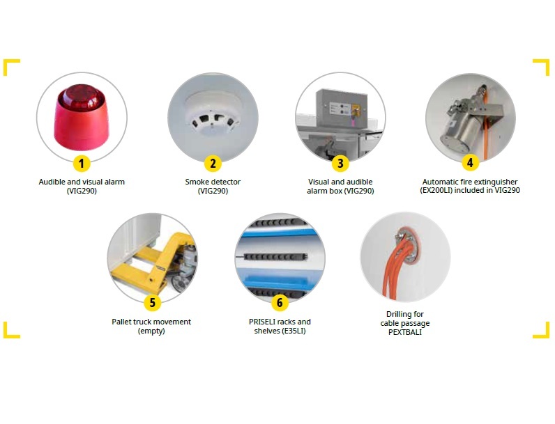 Le prix en ligne comprend une armoire haute de 90 minutes résistante au feu pour batteries Li-ion, pré-équipée de 4 étagères E35LI + 1 x VIG290 (alarme visuelle et sonore, boîtier de contrôle, détecteur de fumée automatique, extincteur EX200LI et conduit de câble sur le dessus.