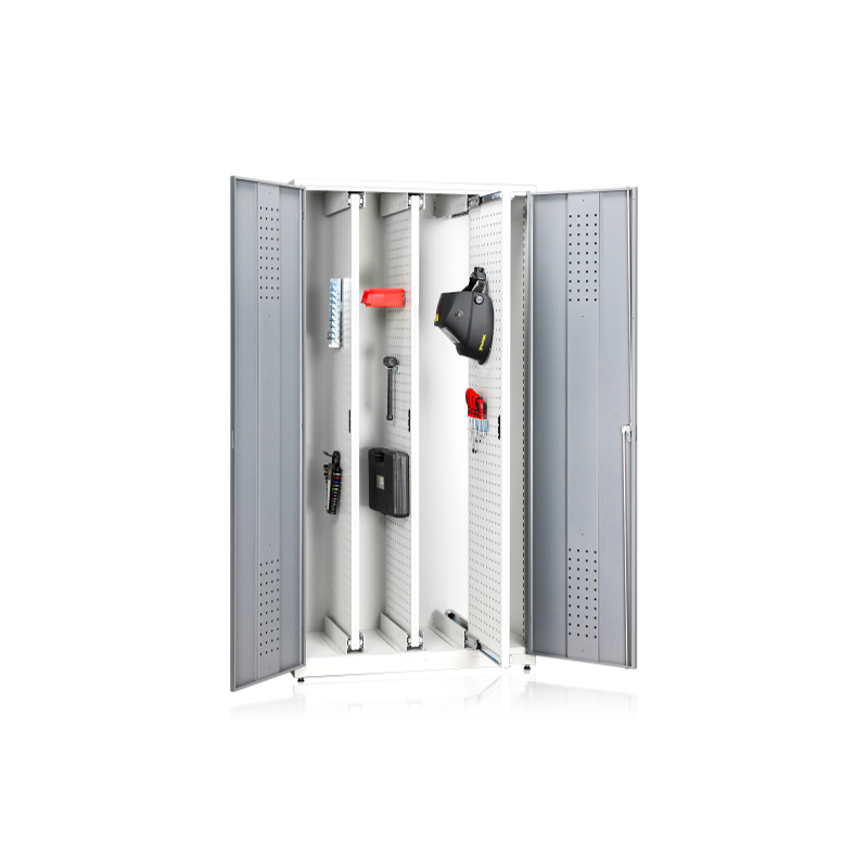 L’armoire est équipée de pieds réglables, ce qui lui permet de rester stable même sur des surfaces irrégulières. La finition laquée gris en deux teintes comporte des portes plus foncées afin de réduire les traces de doigts et la saleté.
