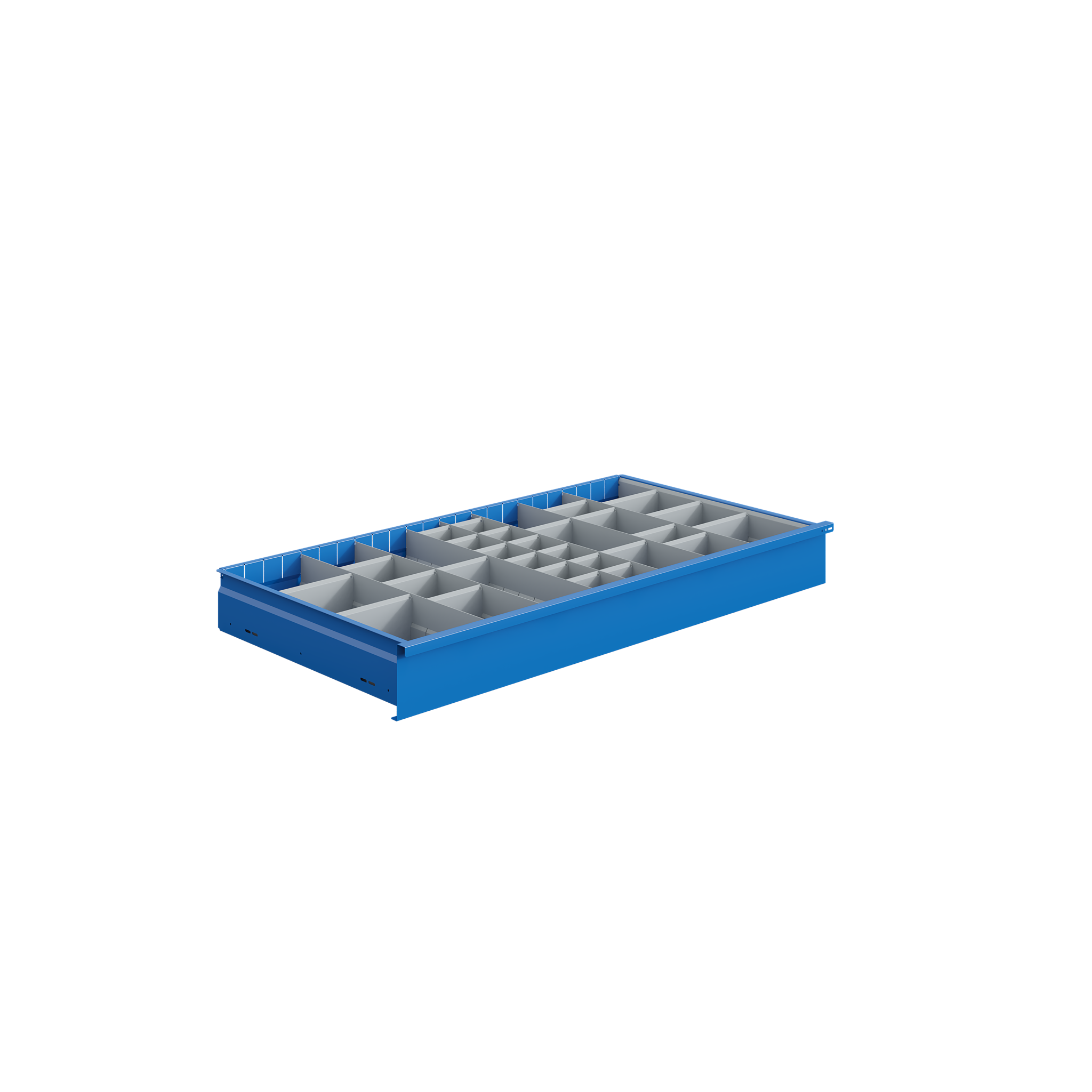 par vis. La structure est finie par peinture en poudre. Epoxy structuré à texture fine polymérisé au four à 180°C. Les tiroirs sont réalisés à partir de tôles d'acier d'épaisseur 10/10ème et 25/10ème pliées et assemblées par rivetage. Les tiroirs hauteur 75, 100, 125 et 150 mm sont rainurés en façade
