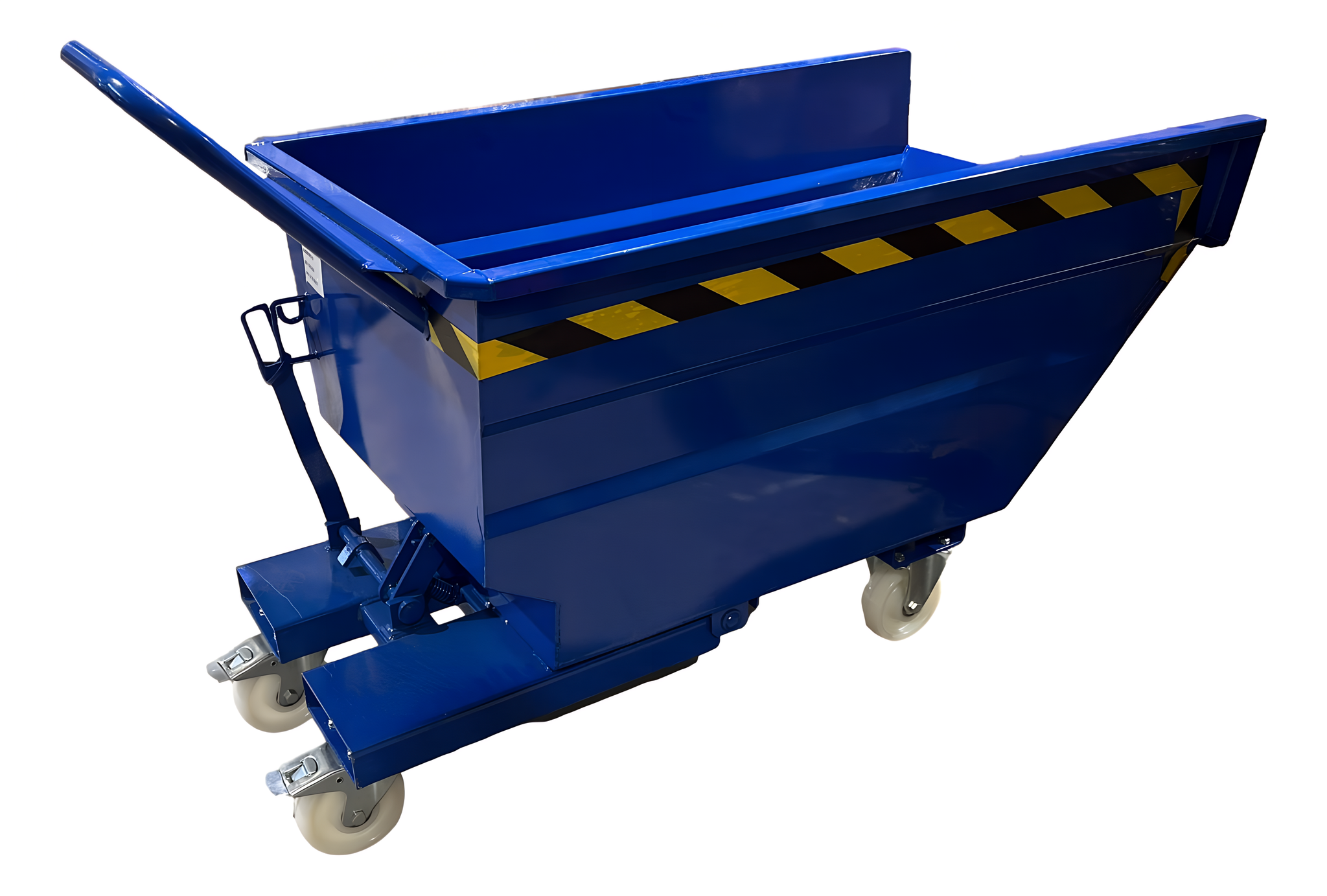 De container is voorzien van een frontale kiep-/leegmechanisme met 90° kanteling, waardoor snel en volledig legen mogelijk is. Het ledigen kan veilig vanuit de bestuurdersstoel van de heftruck via een trekkoord worden bediend. Wanneer de container weer in verticale positie wordt geplaatst, vergrendelt hij automatisch, wat de veiligheid en controle verhoogt. Een veiligheidsketting voorkomt dat de container van de lepels van de heftruck kan schuiven.