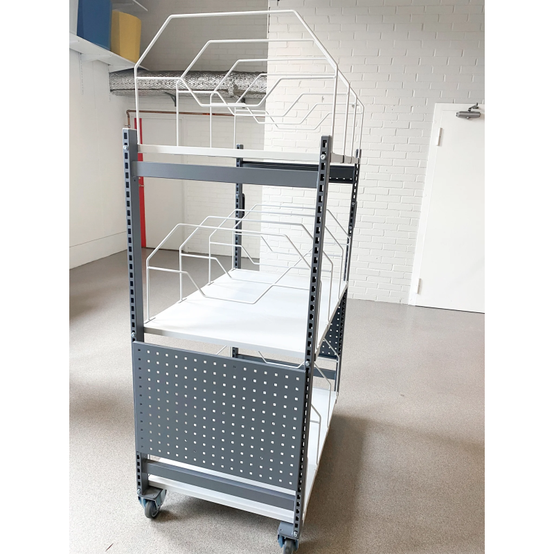 De trolley beschikt over drie legborden en wordt geleverd met vier vakverdelers per legbord, waardoor kartonnen dozen en verpakkingsmateriaal overzichtelijk kunnen worden georganiseerd.